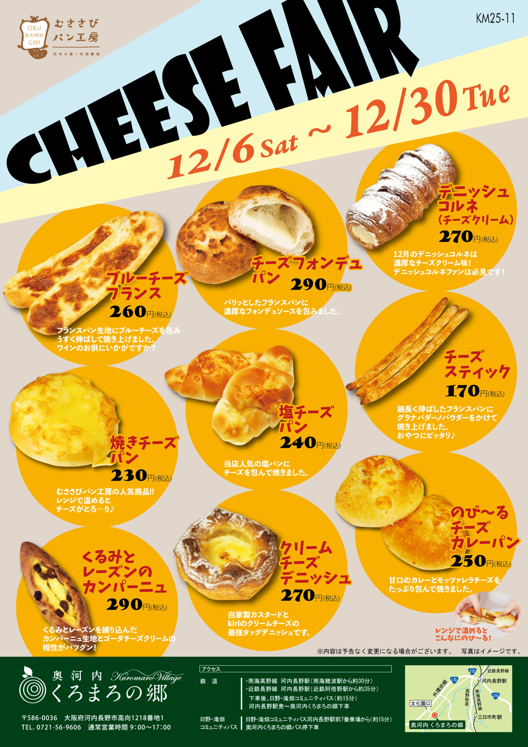 本日 12/7からチーズフェアがスタート! 2025年12月06日(土) むささびパン工房では12/6よりチーズフェアがスタートしました!! 毎年人気のチーズを使ったパンの数々をぜひお楽しみくださいね! カフェページに戻る