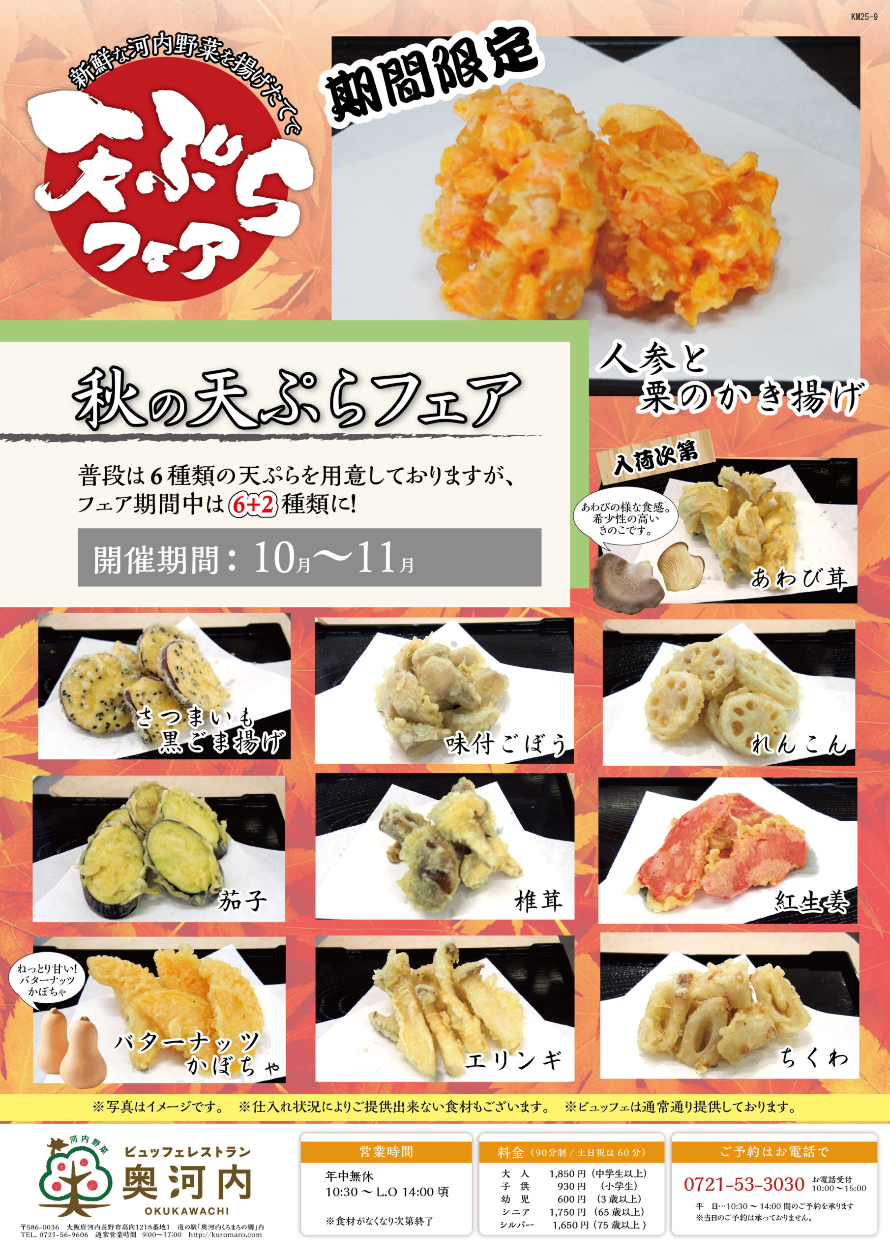 10月より秋の天ぷらフェアが始まります! 2025年10月01日(水) ビュッフェレストラン奥河内です! 10月より秋の天ぷらフェア始まりますっっ! 秋の味覚たっぷりのサクサク熱々の天ぷらをお楽しみ下さい! 皆様のご来店お待ちしております。 地産地消レストランページに戻る